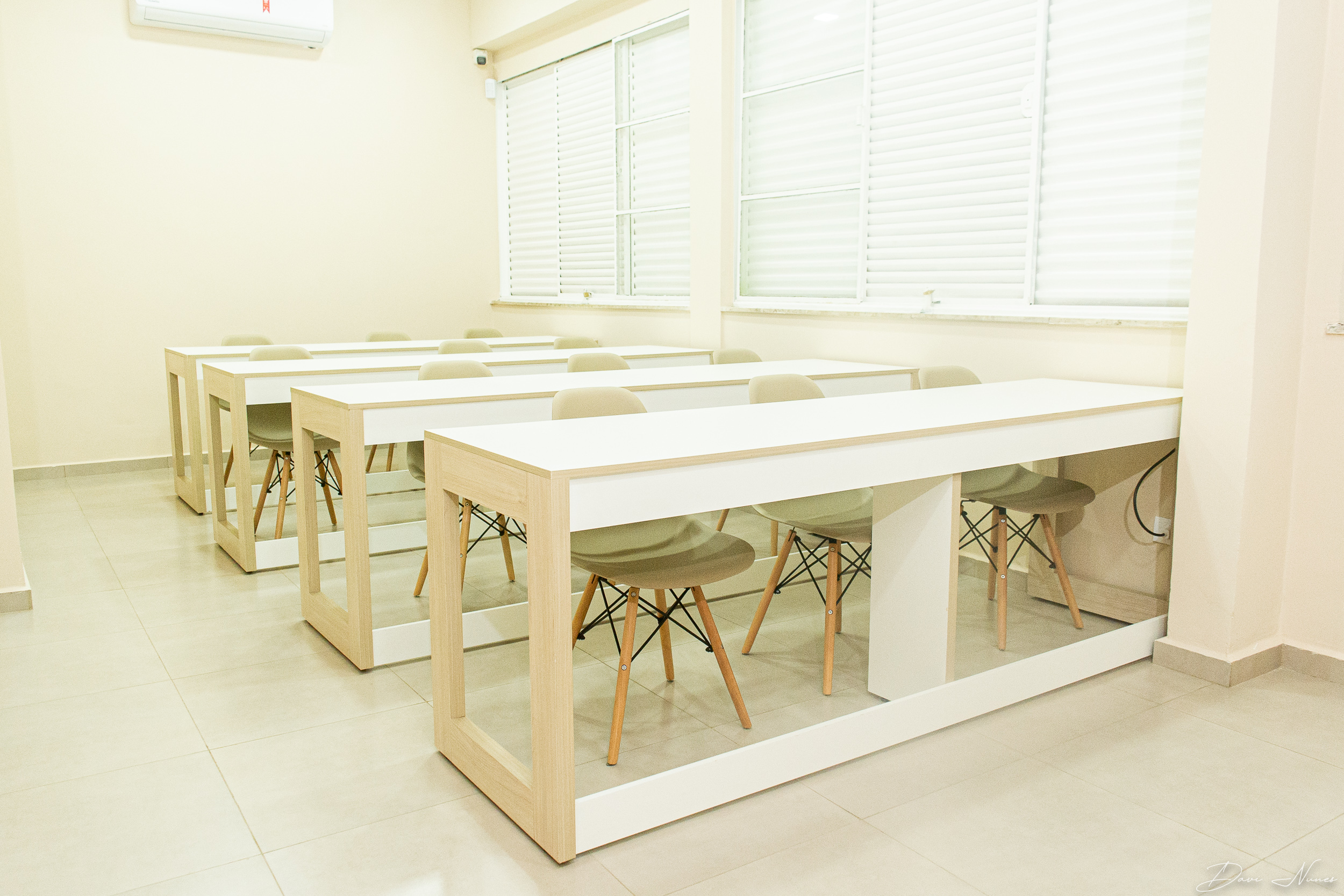 O ambiente possui Wi-fi, 2 banheiros, recepção, 1 sala de reunião, telão e copa, para garantir conforto e conveniência para os professores e alunos.